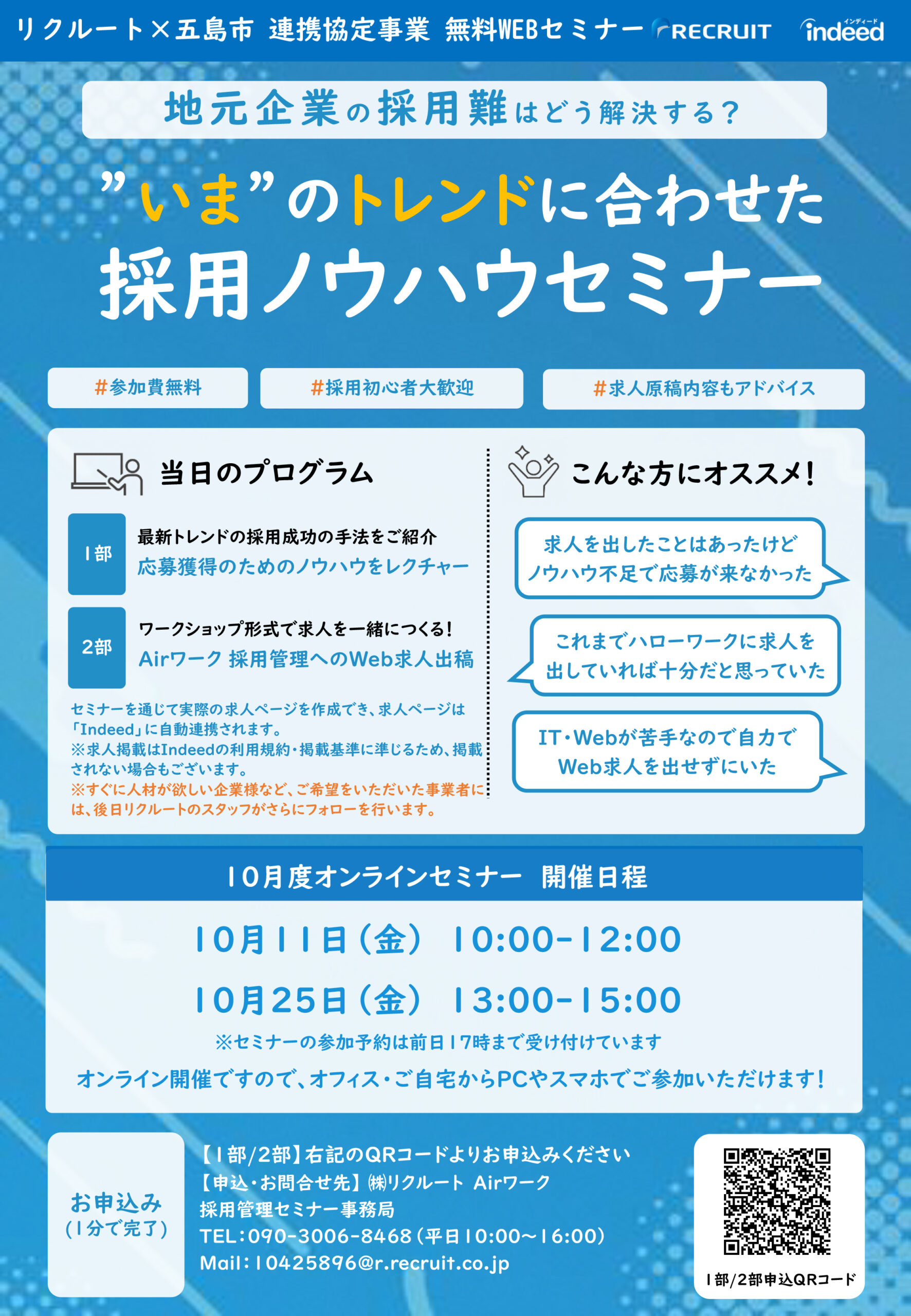 株式会社リクルートと五島市は、地域活性化に向けた地域定着と雇用促進に関する連携協定を締結しており、連携事業として、五島市内事業者を対象とする「WEB求人サポートセミナー」をオンラインにて開催します。